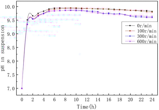 - Through the hydrolysis experiments under different conditions, we found that the suspension pH increased sharply during the 0–2 h period. With the prolongation of reaction time, the suspension pH decreased slowly, exhibiting greater values at low rotational speeds (0 and 100 r min−1) than at high rotational speeds (300 and 600 r min−1). Meanwhile, the rise in temperature can significantly lower the maximum pH of the suspension in the system.