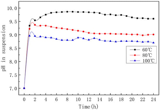 Figure 8 depicts the variation trends of the suspension pH under different temperatures at 300 r min−1. Clearly, at the 0–2 h reaction stage, the suspension pH values at various temperatures increased sharply. With the prolongation of reaction time, the maximal pH values could be maintained at different temperatures for certain periods of time, since the reaction rate was sufficient to keep the system saturated. Eventually, however, the pH values dropped slowly due to the decrease in the reaction rate and the slow release of ammonia. The suspension pH reading was the highest (approximately 9.8) at a temperature of 60 °C, whereas it was the lowest (only about 9.0) at 100 °C.