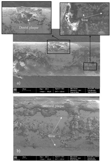 Firstly, wear tracks related to fretting corrosion were observed in the bracket slot, Figure 4a, which contacts the archwire under load—the counterpart region of the surfaces observed in Figure 2. Wear tracks were also found on the brackets’ “hooks”, Figure 4b, in which metallic ligatures were anchored during the orthodontic treatment. Furthermore, orthodontists manipulate the appliances with metallic tools (placement, tightening, removal), which also damage the surface, e.g., the plastic deformation “tracks” displayed in Figure 4c. A more severe and deeper plastic deformation morphology was found on the tube surface, as can be seen in Figure 6b, due to handling. Even the masticatory process itself may cause surface “scratches” and “notching” [3], and, in consequence, passive film or biofilm disruption [8].