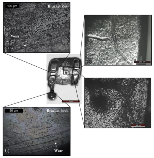 SS bracket after two years of intraoral use: optical microscopy (OM) micrographs showing (a,b) fretting corrosion; (c) deformation tracks by archwires manipulation; (d) biofilm-covered pitting corrosion.