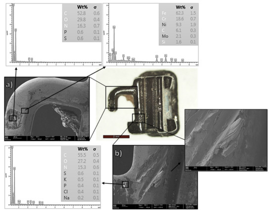 Indeed, pronounced, highly adherent biofilm layers observed by OM (Figure 4d) were confirmed by SEM–EDS analysis. As can be seen in Figure 5 and Figure 6, the EDS results confirmed the presence of organic material, mainly composed of carbon (more than 50 wt.%), oxygen, and nitrogen. Notice the accumulation of biofilm inside the component’s cavity, Figure 5b and Figure 6a. Further observation revealed evident pitting corrosion morphologies underneath the removed biofilm layers, as shown in Figure 5a for the bracket clinically used for two years. As described previously for NiTi archwires, the microorganisms can promote the corrosion of metallic surfaces underneath the biofilm layers (microbiologically induced corrosion) through the generation of microgalvanic cells [8]. Certain anaerobic bacteria found in the mouth can also reduce sulfates (sulfate-reducing bacteria) and release by-products (such as H2, H2S, and FeS) that induce strong local cathodes and gradually destroy the metallic surface [8,66]. The evident pitting corrosion morphologies, well documented in Figure 5a, are likely a consequence of microbiologically induced corrosion.