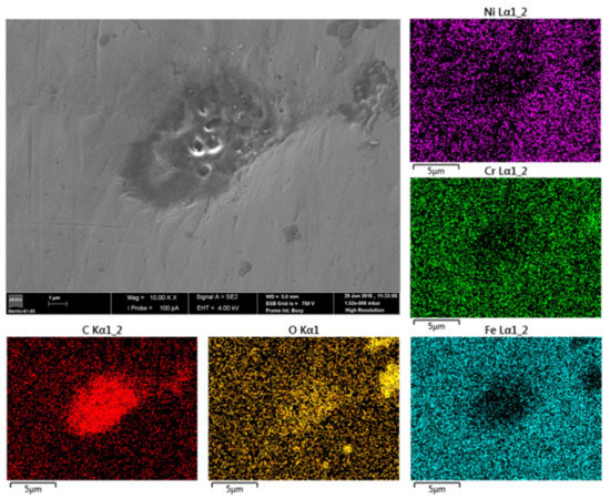 SS tube after two years of intraoral use: surface SEM micrograph and the corresponding EDS elemental distribution maps.
