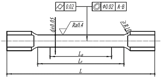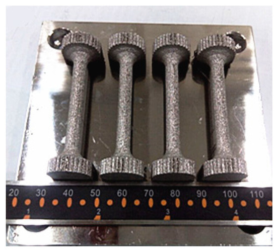 The tensile pieces after SLM device molding were adopted, as shown in Figure 10. The test pieces were processed with simple polishing, and the surface roughness could reach 4.3 μm, which satisfied the requirements of the tensile test pieces.