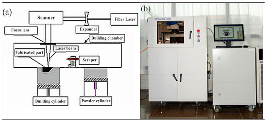 SLM manufacturing principle and apparatus: (a) The SLM manufacturing principle; (b) SLM equipment Dimetal-100.