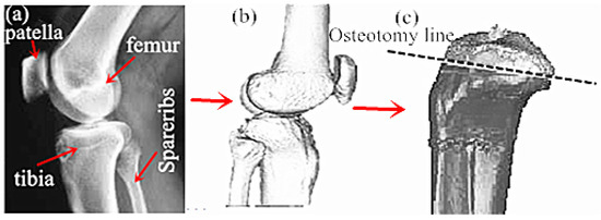 Figure 3. Reconstruction of reverse osteotomy of tibial implants: (a) CT image of knee joint; (b) Post reconstruction effect; (c) Bone cutting surface selection. - ②