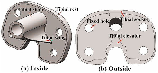 - The substantialized tibial implant bone cutting model was imported into the Rhinocero software for forward design, and the corresponding tibial implant model was selected based on the bone cutting surface size and status. Meanwhile, the size and shape of the tibial stem, tibial wing, tibial convex plate, tibial groove and tibial articular surface were adjusted to adapt to the tibial articular surface and complete the forward design of the tibial implant, as displayed in Figure 4.
