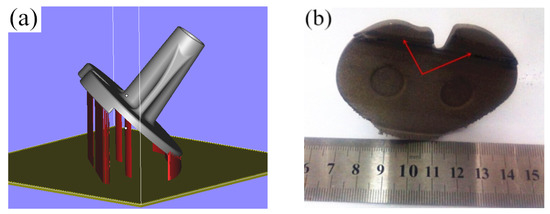 On the account of the deformation of the fixation site of the tibial articular surface after SLM molding, the tibial fixation site could be overturned downward and could avoid the contact of recess in the fixation site of the tibial articular surface with the structure. Additionally, to improve the surface quality of the tibial articular surface, the inclination angle of the tibial articular surface could be reduced to avoid excessive suspending of the molding part. The part placement position was adjusted based on the above optimization principles after the addition of the structure, as shown in Figure 8a. Then, the part was sectioned at a layer thickness of 0.035 mm, a total of 1472 layers were obtained, and the molding time was 5.2 h. It could be discovered after observing the SLM molding part effect in Figure 8b that no obvious buckling deformation was observed in the fixation site of the tibial articular surface, and the tibial articular surface quality was also partially improved. However, optimizing the part placement manner could solve the above problems, but it would also lead to an increased additive amount of structure and molding time. Moreover, the tibial articular surface quality remains to be improved. Consequently, the placement manner of the tibial implant could be further optimized.