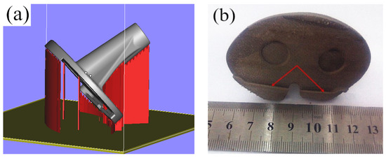 The designed tibial implant was imported into Magics 15.01 in STL format for different placements of the part. First, the tibial implant placement position was adjusted to the conventional inclination of 45° for conventional placement. Subsequently, the structure was added, the part was sectioned at the layer thickness of 0.035 mm, the total layer of the part was 1532, and the molding time was 5.1 h, as shown in Figure 7a. In Figure 7a, the red part was the part structure, while the silver part was the tibial implant. It can be discovered through observing the surface quality of the SLM molding tibial implant in Figure 7b after removing the structure that the molding effect in the site contacting the structure was poor, and the surface quality of the tibial articular surface at the 45° suspending part was also poor. Moreover, there was an obvious adhering slag phenomenon, the fixation part of the tibial articular surface was partially deformed, and the additive structure in the recess site could hardly be removed, as denoted by the red notes in Figure 7b. The deformation in the fixation site of the tibial articular surface might be related to its contact with the structure during the molding process, while the poor surface quality on the tibial articular surface might be related to the excessive suspending. Consequently, further optimization of the tibial implant placement manner should be performed based on the above-mentioned problems.