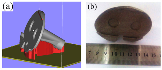 To improve the tibial articular surface molding quality, reduce the deformation in the fixation site of the tibial articular surface, and shorten the molding time, the tibial articular surface molding suspension could be further decreased, structure additive should be avoided in the fixation site of tibial articular surface, and the part molding height should also be reduced. The placement of the tibial implant was optimized based on the above considerations, and the optimized part placement manner is displayed in Figure 9a. After completing part position adjustment and structure addition, the part was sectioned at the layer thickness of 0.035 mm, a total of 1392 layers were obtained, and the molding time was 4.8 h. The SLM molding part effect is illustrated in Figure 9b. As can be observed, no buckling deformation was observed in the fixation site of the tibial articular surface, the tibial articular surface quality was improved, the part molding time was partially decreased, and the part satisfied the implantation requirements after post-processing.