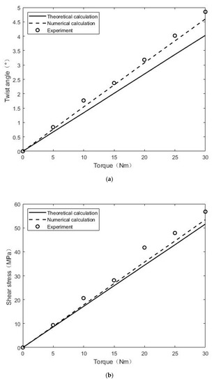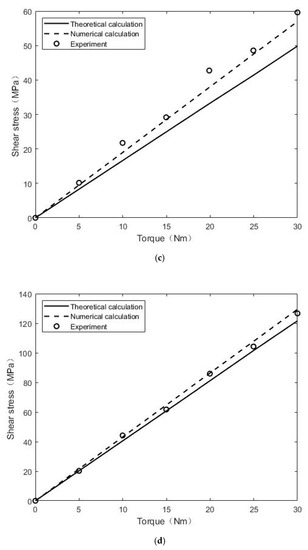 For the torsion bar, shear failure is the main form of failure. Therefore, shear stress generated in the torsion process is the main concern in the test and numerical simulations. It can be seen from the data in [17] that the shear stress results obtained by the theoretical and numerical calculations generally showed good agreement with those of the test. In particular, the shear stress data measured at points C and D on the middle section of the bar were consistent with the calculated results, with the maximum error within 10%. However, the data measured at test points A and B on the quarter-length section of the bar show that the calculation error was relatively larger.