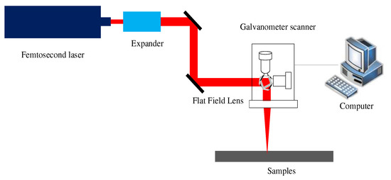 The experimental setup used for this study includes a femtosecond laser, a beam expanding mirror, two reflectors, a galvanometer, an f-θ lens, a controller, and a three-axis motion platform, as shown in Figure 1. The sample was loaded on a special fixture and accurately positioned before processing. The laser beam was focused by a flat field lens (Lenstek Laser Optics, FL-1064-70-100, Nanjing, China) after passing through the galvanometer (SCANLAB, SCANcube @III14, Puchheim, Germany). The femtosecond laser was produced by Light Conversion (Vilnius, Lithuania). It delivers a 290 fs width pulse with a maximum pulse energy of 200 µJ and works at a wavelength of 1028 ± 5 nm, and its maximum repetition rate is 1100 kHz. The laser has an adjustable power range from 1 W to 10 W, and the energy density distribution of the laser beam is a Gaussian distribution with a beam quality factor (M2) of approximately 1.2. The main parameters of the laser used in the experiments are listed in Table 1.