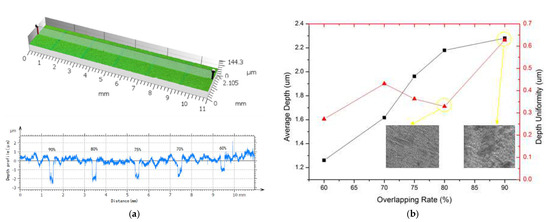 (a) Confocal data of depth profiles of the microgroove with different overlapping rates (from 90% to 60%). (b) Depth uniformity of the microgroove under different overlapping rates (from 90% to 60%).