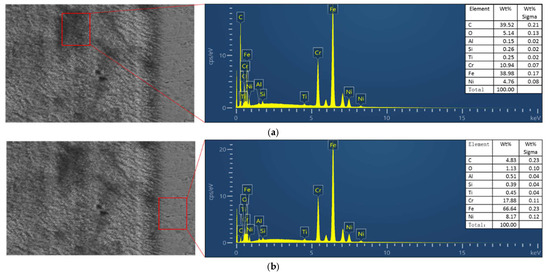 Considering the measurement error, we took the average value for each measured area to improve the accuracy of the measured value. It was found that with decreasing laser overlapping rates, the depth of the microgroove also decreased. This is because the laser pulse energy per unit area of the material decreases as the laser pulse overlap area decreases, and this phenomenon is consistent with previous research results [18]. There is also a relationship between the depth uniformity at the bottom of the microgroove and the overlap rate of laser pulses. When the pulse overlap rate was 60~80%, the depth uniformity at the bottom of the microgroove changed very little, which meant that it was helpful to improve the uniformity of the bottom depth of the microgroove (see Figure 3a). When the pulse overlap rate gradually increased to 90%, the depth uniformity at the bottom of the microgroove changed greatly and became increasingly worse. This is because when the laser pulse overlap rate is too high, the laser energy acting on the material per unit area increases. Part of this energy vaporizes the material, but the remaining excess energy melts the material and finally adheres to the surface of the material after cooling, which results in worse depth uniformity of the bottom of the microgroove (see Figure 3b). By scanning electron microscopy, it can be seen that some black solid is attached to the bottom of the microgroove, and the composition was investigated using field emission scanning electron microscopy, by which significant changes in carbon (39.52%) and oxygen (5.14%) were found in the black solid compared with the no-ablation area (carbon 4.83%, oxygen 1.13%) (see Figure 4). From the comparison of element composition, the black solid was oxide, and oxidation increased upon femtosecond laser machining in air [21].