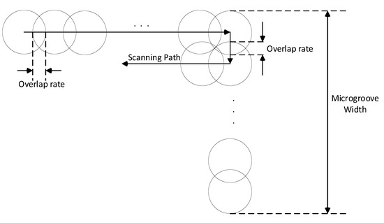 In this study, we ablated 0.14 mm width and 0.07 mm depth microgrooves to achieve special performance of the sample. According to the laser pulse overlap rate parameter selected above, the microgroove width, sweep line spacing of the scanning path and the number of sweep lines are determined, as shown in Figure 5.