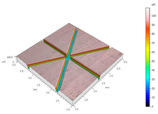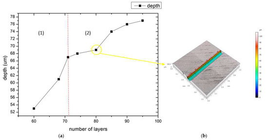 Furthermore, it is necessary to investigate how to process the depth of the microgroove. In some studies, the effect of laser etching parameters on the depth of the microgroove was investigated. Niroj Maharjan et al. [22] studied the effect of laser pulse number on the ablation depth of Ti–6Al–4 V. Chung-Wei Cheng et al. [21] explored the influence of the laser energy field formed by different laser scanning line spacing on the ablation depth of stainless steel and verified the results by experiments. However, their findings can be applied only to a small number of layers of laser scanning to obtain a microgroove depth consistent with the theory. The depth of the microgroove processed in this test is 70 µm and requires multiple layered laser scanning of the material, for which it is difficult to predict the machining depth of the microgroove accurately because of the nonlinear absorption of the laser. Therefore, the experimental method is adopted to process the microgroove by using laser scanning with different layer number parameters, and then the ablation depth of the microgroove under different layer numbers is obtained to obtain the required laser processing layer parameters. Figure 6 shows the effect of the number of laser scanning layers on the ablation depth of the microgrooves. This shows that with an increase in the number of scanning layers, the ablation depth of the microgroove also increases. The growth rate of ablation depth can be divided into two regions ((1), (2)), as shown in Figure 6. This is because the laser focus is on the surface of the sample at the beginning of the ablation; as a result, the depth of the microgroove increases rapidly with the increase in the number of scanning layers in the initial stage (1). With an increase in the depth of the microgroove, the spot affected on the material becomes defocused, resulting in the depth of the microgroove ablation no longer increasing significantly with additional scanning layers, as shown in region (2). More importantly, 80 scanning layers corresponded to the 70 µm microgroove (indicated by the yellow circle in Figure 6), which was the required laser ablation parameter, and the three-dimensional morphology of the microgrooves was obtained by confocal microscopy. It was found that the shape of the cross-sectional morphology of the microgroove was an inverted trapezoid. This is because when the laser was focused, the focused beam was similar to a cone. Therefore, with the increasing depth of the microgroove, the scanning beam was easily obscured by the edge of the microgroove, resulting in the formation of a slope on two sides of the microgroove during the formation of the microgroove. Nevertheless, the resulting width error of the microgroove section meets the machining requirements of the bursting disc microgroove and does not affect the depth uniformity of the microgroove, which is the focus of this paper.