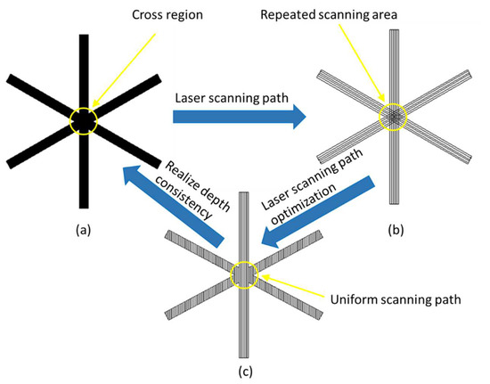 (a) The shape of the bursting disc microgroove. (b) Each microgroove uses a different scanning path, resulting in repeated scanning of the cross region. (c) Unification of scanning paths to ensure the consistency of the microgroove depth.