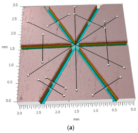 As discussed above, and considering the processing efficiency without affecting the uniformity of processing depth, the specific processing parameters were chosen, as follows: the laser fluence was 2.55 J/cm2, the overlapping rate was 80%, and the laser scanning layers were 80. Furthermore, to achieve better rupture performance of the bursting disc, a specific-shaped microgroove should be ablated on the bursting disc, as shown in Figure 7a. The figure presents three staggered identical microgrooves with an angle of 60° between each other. It is worth noting that there are cross regions between the microgrooves; if each microgroove uses different scanning paths separately, the depth of the microgrooves in this region will be much higher than that in other microgrooves due to repeated laser scanning (Figure 7b). Considering this factor, we optimized the laser scanning path, unifying the laser scanning path of the three microgrooves. In this way, the laser scanning times of the cross region are consistent with those of other regions, thus ensuring the uniformity of depth at different positions of the microgrooves (Figure 7c). In addition, the scanning path of each layer is rotated 60° relative to the previous layer to adapt to the direction scanning path of each microgroove to obtain a more uniform morphology at the bottom of each microgroove.