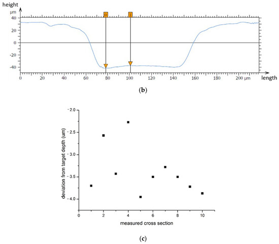 Ten different section positions were selected randomly for depth measurement: (a) measurement position of the microgroove cross section, (b) bottom morphology of the microgroove and the depth difference between the highest point and the lowest point, and (c) deviation from the target depth.
