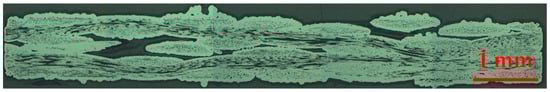 To gain information on damage evolution (matrix multicracking) within the composite during tensile mechanical loading, up to 6 unloading–reloading sequences were conducted. Details about this testing procedure are available in [36]. E0 is the initial Young’s modulus (before matrix cracking) and is measured by the slope of the initial linear part of the stress–strain curve. Unloading–reloading cycles lead to the determination of reduced modulus (E/E0), area of the cycles (∆W) and anelastic residual strains after unloading (εr) [39,40]. The longitudinal elastic modulus (E) is determined by measuring the slope of the line passing through the summit of cycle (σmax, emax) and the median point of the cycle for a σmax/2 stress [36,41]. Reduced modulus decreases as a function of applied stress due to matrix multicracking occurring with raising stress. At high stress, if complete matrix multicracking occurs, the reduced modulus reaches an asymptotic behavior related to the fiber fraction in the mechanical solicitation direction and Young’s modulus as expressed in Equation (2). Ef and Vf are the tow Young’s modulus and the fiber volume fraction in composite, respectively. X is the volume fraction of fiber oriented in the tensile mechanical load direction (i.e., warp direction). In this study, X = 0.429 for the specific 2.5D woven architecture described in § 2.1.