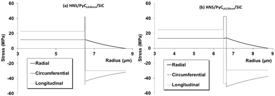 The calculated residual thermal stresses of all SiC/SiC samples are presented in Figure 3. For all the composites, the level of residual thermal stresses in the fiber and matrix are similar and sufficiently low to ensure that fibers and matrix are undamaged after CVI processing (neither matrix cracks nor fiber failure). No effect of PyC thickness and texture is observed on fiber and matrix residual thermal stresses. The interphase is under tension in radial and circumferential directions and under compression in the longitudinal direction for all SiC/SiC samples. Interphase stresses in longitudinal and circumferential directions are quite high for the HA interphase.
