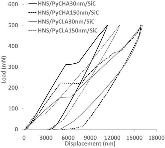 Typical push-out test curve of HNS/PyCHA30nm/SiC, HNS/PyCHA150nm/SiC, HNS/PyCLA30nm/SiC and HNS/PyCLA150nm/SiC.