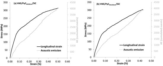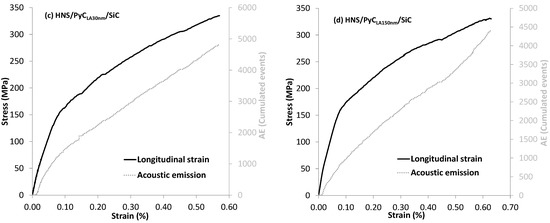Typical stress–strain curves with cumulated AE signals are presented in Figure 6 for each type of SiC/SiC specimen and summarized in Figure 7 for easier comparison. Mechanical properties are given in Table 6. Mechanical behaviors of all specimens are similar and correspond to intermediate/high interfacial shear stress (ISS) mechanical behavior [44,45]. Composites made of PyCLA have lower moduli and higher failure strain than PyCHA composites. No influence of interphase thickness is highlighted. For the same PyC interphase texture (LA or HA), modulus and failure characteristics are similar for 50 and 150 nm PyC thicknesses.