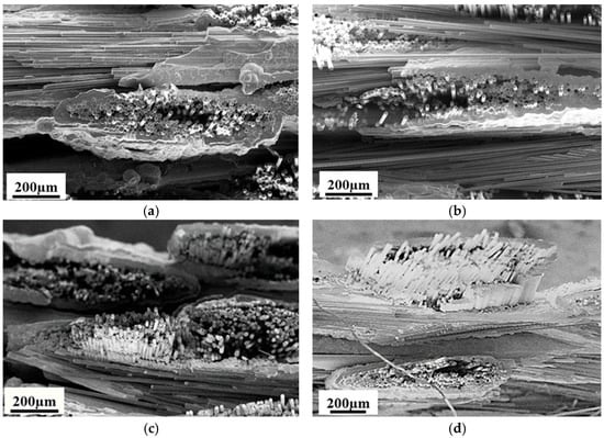 If mechanical tensile tests and consecutive fracture surfaces only allow assessing the qualitative effect of PyC texture or thickness, push-out tests allow quantitative evaluation of F/M bonding strength by the determination of debonding shear stress (σd) and interfacial shear stress (τ). It is clear that PyCHA induces higher F/M bonding than PyCLA in HNS-reinforced composites, σd being three times higher for PyCHA (Table 5). The influence of PyC thickness is also highlighted for both types of PyC. PyC tends to decrease F/M bonding, as already observed in previous studies [29,30]. It is demonstrated in this study that the influence of PyC thickness is more pronounced for PyCLA. This confirms qualitative observations based on fracture surfaces analysis. To understand the rupture mode of F/M bonding in all materials, high magnification SEM micrographs of typical F/M debonding zone for all specimens after the tensile test are presented in Figure 11.