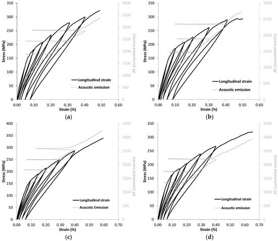 Typical tensile stress–strain behaviors with unloading–reloading sequences with evolution of cumulated AE signal for (a) HNS/PyCHA30nm/SiC, (b) HNS/PyCHA150nm/SiC, (c) HNS/PyCLA30nm/SiC and (d) HNS/PyCLA150nm/SiC.