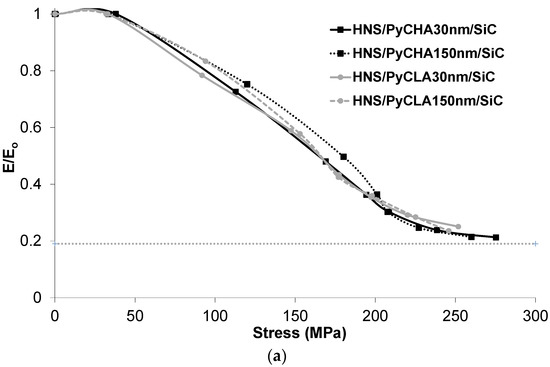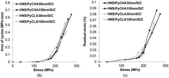 The evolution of reduced modulus (Figure 10a) is similar for all materials, with a rapid decrease above 50 MPa consecutive to the beginning of the matrix multicracking phenomenon. The saturation value of matrix cracking (Equation (2)) is reached in the 200–250 MPa range, before the ultimate failure, as observed in previous studies on HNS-based composites [25,36]. This tends to demonstrate that ISS is not strong, but intermediate for these materials. No significant influence of interphase texture and/or thickness is observed on reduced modulus. The analyses of the area of cycles (Figure 10b) and residual strains (Figure 10c) evolution led to the same conclusions; therefore, PyC texture and/or thickness (within the studied range) have no significant influence on the composite damage resistance (matrix cracking and/or opening of existing cracks).