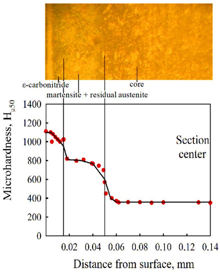 During the nitrocarburizing of steels, nitrogenous martensite and small dispersed particles of carbonitrides are formed in the diffusion layers. As a result, a multiphase system is formed with enhanced mechanical properties. Simultaneously, compression stress occurs in the nitrocarburized layer [8]. Additionally, in [10,11], the high fatigue strength of carburized and nitrocarburized parts is explained by the high yield point of the surface layer.