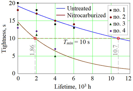 Therefore, nitrocarburizing allows increasing tightness of valves by 29–54% for their lifecycle of 2000 h. Moreover, after 4000 h, valves without chemical–thermal treatment become inoperable. However, nitrocarburized valves remain effective even after 6000 h of their lifetime. In this case, the tightness decreases only by 22–35%.