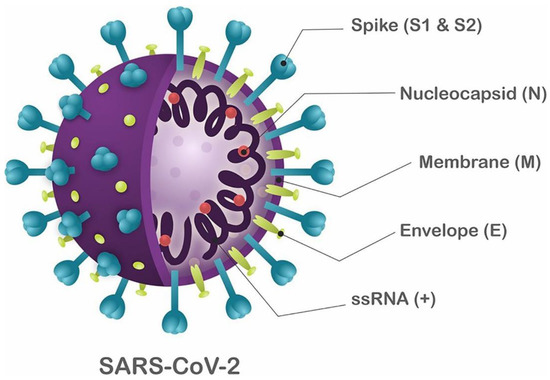 SARS-CoV-2 has a spherical shape with a diameter ranging from 60 nm to 140 nm and distinctive spikes ranging from 9 nm to 12 nm. This gives SARS-CoV-2 virions a look similar to that of the solar corona (Figure 1) [31]. SARS-CoV-2 is assumed to infect new hosts by changing its spike protein and structure through genetic recombination and variation.