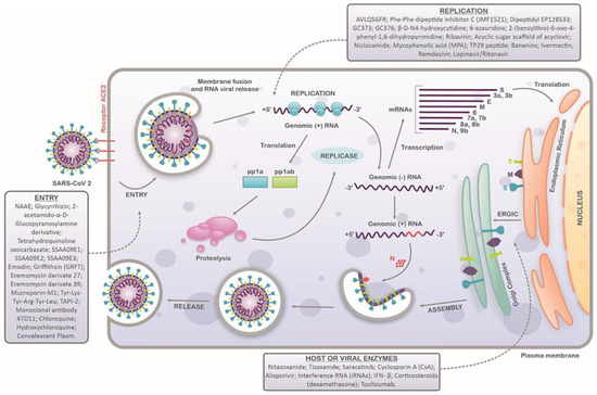 Schematic representation of SARS-CoV-2 replication cycle in host cells. SARS-CoV-2 attaches to the host cells by interacting with the ACE2 receptors and spike proteins. After entry, the viral uncoating process releases the viral genome, and the replication stage occurs (translation and transcription). Structural proteins are produced in the intermediate compartment of the endoplasmic reticulum with the Golgi complex and forwarded to assembly, packaging, and virus release. Compounds with antiviral activity against SARS-CoV-2 are indicated in each step of the virus replication cycle. Adapted with permission from ref. [32], published by Frontiers, 2020.