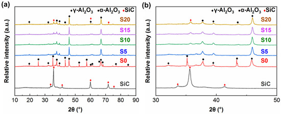 Figure 2 exhibits the XRD patterns of the samples prepared by CPED in electrolytes without SiC nanoparticles and in electrolytes containing different concentrations of SiC nanoparticles. As seen from Figure 2a, no diffraction peaks of the substrate are detected in any sample, indicating that the coatings have a certain thickness and compactness, which cannot be penetrated by X-rays. The coating prepared in the electrolytes without SiC (sample S0) consists of α-Al2O3 and γ-Al2O3, in which α-Al2O3 is the main phase. The diffraction peaks of the coatings prepared in the SiC-containing electrolytes (samples S5, S10, S15 and S20) correspond to the composition of Al2O3 and SiC. As seen from Figure 2b, with the increased content of SiC nanoparticles in the electrolyte, the intensity of the α-Al2O3 diffraction peak gradually decreases, almost disappearing, whereas the diffraction peak of γ-Al2O3 gradually increases. The formation of α-Al2O3 requires a higher temperature than that required for γ-Al2O3. The phase transformation of Al2O3 was listed as follows [28]: