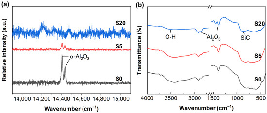 Figure 3 shows the Raman and FTIR spectra of samples S0, S5 and S20. Because Al2O3 has a strong fluorescence effect in the Raman spectroscopy test, which masks the characteristic peaks caused by vibration, the characteristic peaks of fluorescence are used for characterization. As shown in Figure 3a, the R line (double) produced at about 14,400 cm−1 is a typical characteristic peak of α-Al2O3 [29]. The intensity of the characteristic peak of S0 is the highest, that of S5 is weakened and that of S20 almost disappears. The results from Raman spectra are in agreement with those of XRD. No characteristics Raman peaks of γ-Al2O3 are not detected due to γ-Al2O3 having no Raman activity. According to the decrease in α-Al2O3 content, it can be speculated that γ-Al2O3 increases. Figure 3b presents the FTIR spectra of the samples. According to the SDBS database, the characteristic peaks located at 2925 cm−1, 2855 cm−1, 1469 cm−1 and 1378 cm−1 correspond to Al2O3. The characteristic peak at 3450 cm−1 [30] is caused by the stretching of the O-H bond. The characteristic peak at 812 cm−1 [31] in sample S20 originates from the fundamental vibrations of the Si and C in SiC, indicating the presence of SiC in the sample. The infrared spectral signal of SiC is very weak because SiC is a nanoscale particle with low content in the sample.