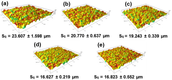 Figure 5 summarizes the surface roughness (Sq) of the Al2O3 coating (sample S0) and Al2O3–SiC composite coatings (samples S5, S10, S15 and S20). As shown in Figure 5, the surface of the Al2O3–SiC composite coatings is smoother than that of the Al2O3 coatings, although the power supply process parameters and deposition time for coating preparation are the same. When increasing the concentration of SiC nanoparticles in the CPED electrolyte from 0 to 15 g/L, the Sq value of the coating decreases from 23.607 ± 1.598 μm to 16.627 ± 0.219 μm. However, when the content of SiC nanoparticles is further increased to 20 g/L, the value of Sq slightly increases. The change in coatings roughness is consistent with the evolution of coatings surface morphologies (Figure 4c–f).