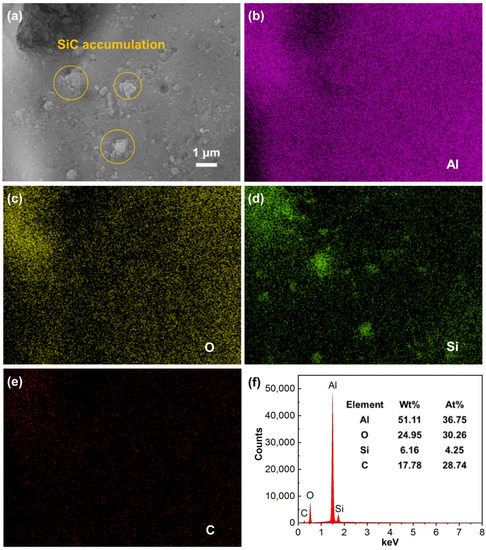 SEM morphology and elemental mappings of sample S20: (a) nanoscale surface morphology of sample S20; (b–e) Al, O, Si and C mappings; (f) EDS spectrum of the whole area.