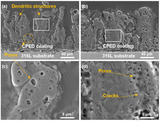 The cross-sectional morphologies of sample S0 and S15 coatings were characterized, as shown in Figure 7. It can be seen from Figure 7a that the Al2O3 coating (sample S0) is well bonded to 316L stainless steel substrate, and a large number of dendritic structures and pores are observed. The existence of dendritic structures leads to the loose coating. Notably, the coating near the substrate region still exhibits excellent compactness. Compared with the Al2O3 coating, the dendritic structure of the Al2O3–SiC composite coating (sample S15) is significantly smaller, and the dense layer near the substrate is thicker, as shown in Figure 7b. The average thickness of the two coatings is similar, both approximately 120 μm. Figure 7c shows a typical dendritic structure of the Al2O3 coating, on which pores of varying sizes can be observed. Figure 7d reveals the high magnification cross-sectional morphology of the composite coating, where the compactness is significantly improved compared with the Al2O3 coating, despite the existence of pores and cracks. The dendritic structures are the cross section of crater-like bulges on the coating surface. The uneven pores on the cross section are formed when some gases cannot escape in time during the cooling process of molten Al2O3 during CPED. Moreover, the size of dendritic structures decreased dramatically after the introduction of SiC nanoparticles, which depends on the altered electrical behavior of SiC nanoparticles during CPED.