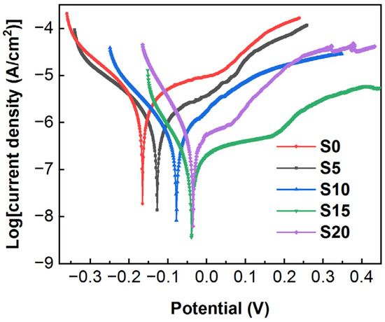 Figure 8 exhibits the potentiodynamic polarization curves for the Al2O3 coating (sample S0) and the Al2O3–SiC composite coatings (sample S5, S10, S15 and S20). It can be seen from the figure that the corrosion potential of all composite coatings is more positive and the corrosion current density is lower compared with that of Al2O3 coatings, indicating that the incorporation of SiC nanoparticles gives the composite coatings superior corrosion resistance than that of Al2O3 coatings. The corrosion potential (Ecorr), corrosion current density (icorr), polarization resistance (Rp) and corrosion rate (vcorr) of all CPED coatings are presented in Table 3. The corrosion potential and corrosion current density of Al2O3 coating (sample S0) are −0.165 V and 1.716 × 10−6 A/cm2, respectively. Among all samples, sample S15 exhibits the lowest corrosion current density, with a corrosion potential of −0.039 V and a corrosion current density of 1.118 × 10−7 A/cm2. Sample S20 shows the most positive corrosion potential (representing the least corrosion tendency), with a corrosion potential of −0.035 V and a corrosion current density of 4.968 × 10−7 A/cm2. However, the corrosion current densities of all samples are on the order of 10−6 or 10−7, making it difficult to accurately assess the differences in corrosion resistance [27]. The polarization resistance values are calculated to further evaluate the corrosion resistance. The S15 is found to have the best corrosion resistance, with a polarization resistance of 139,600.9 Ω·cm2, which an order of magnitude higher than that of the other samples. The corrosion rate of S15 is 1.36 µm/year, which is the slowest among all samples. As discussed before, although there are many discharge holes on the surface of the coating, these holes do not penetrate the whole coating. Thus, the dense near-substrate area (Figure 7b) can act as a barrier between the corrosion environment and the substrate. The increase in corrosion resistance of the composite coating is due to the introduction of SiC nanoparticles, which leads to the improvement in coating compactness and thickening of the near-substrate dense layer.