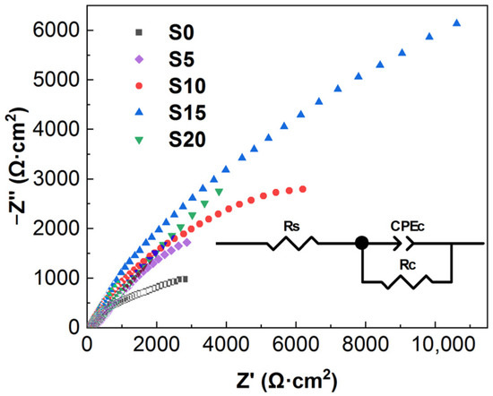 Figure 9 shows the electrochemical impedance plots (Nyquist plots) of the Al2O3 coating (sample S0) and the Al2O3–SiC composite coatings (samples S5, S10, S15 and S20). The radius of capacitance loop characterizes the corrosion resistance of the sample. According to the Nyquist plots, all Al2O3–SiC composite coatings show a larger capacitance loop compared to Al2O3 coatings. Sample S15 exhibits the largest capacitance loop, indicating the best corrosion resistance property. The Nyquist plots were fitted with an equivalent circuit model by Z View software. In this model, Rs is the resistance of the NaCl solution, Rc represents the resistance of the coating and CPEc represents the capacitance of the coating [33]. The Rc value reflects the difficulty of charge transfer in the coating, which is related to the structure of the coating. The fitted R values are listed in Table 4. The Rc values of all Al2O3–SiC composite coatings are larger than that of Al2O3. This shows that the charge is more difficult to transfer after SiC nanoparticles are introduced into the coating because the coating becomes more dense.