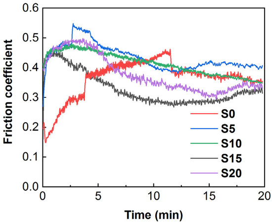 Figure 10 illustrates the friction coefficients of all coatings over time. It can be seen from Figure 10 that the general trend of the friction coefficient variation for all coatings is similar, first increasing rapidly to a peak, followed by a slow decline and becoming relatively stable. For the Al2O3 coating (sample S0), the initial friction coefficient is about 0.15, then suddenly fluctuates after 4 min and gradually increases to 0.5, finally resting at 0.4. The friction coefficient of the Al2O3 coating obviously fluctuates, and the friction coefficients of all composite coatings become relatively stable after incorporation of SiC nanoparticles. When 5 or 10 g/L SiC nanoparticles are added into the electrolyte, the friction coefficient of the composite coatings (samples S5 and S10) are basically the same as that of the Al2O3 coating, which is approximately 0.4. With a further increase in the concentration of SiC nanoparticles to 15 and 20 g/L, the friction coefficient of the composite coatings (samples S15 and S20) are significantly lower than that of Al2O3 coating. In particular, the friction coefficient of sample S15 is the smallest of all the coatings (approximately 0.3). The tribological behavior is related to the properties and surface roughness of the coating itself [34]. Because the main phase component of all samples is Al2O3, the tribological behavior of coatings is mainly related to surface roughness. After incorporating SiC nanoparticles, the surface of the coating becomes more compact and smoother, with decreased surface roughness, which effectively reduces the friction coefficient.