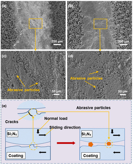 SEM morphologies of wear tracks of CPED coatings and schematic diagram of wear process: (a) wear tracks of sample S0; (b) wear tracks of sample S15; (c) high-magnification image of (a); (d) high-magnification image of (b); (e) schematic diagram of wear process of coating.