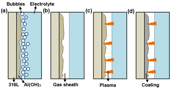 As shown in Figure 13b,c, when the applied voltage is high enough, the cathode surface easily forms a gas sheath that consists of H2 and water vapor, and plasma discharge occurs in the gas sheath [16,37,38]. Faint sparks first appear at the edge of the stainless-steel substrate. After a few minutes, the number of sparks gradually increases, and the entire surface of the substrate is covered by jumping stray sparks. The high temperature in the spark discharge region causes several physical and chemical reactions [39]. Hence, as shown in Figure 13d, the Al(OH)3 produced by reaction (6) is calcined and dehydrated to form Al2O3 by the following reaction under the energy of plasma discharge [40]: