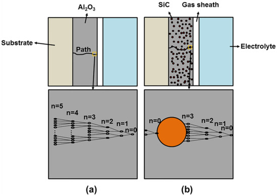 In order to further explain the role of SiC nanoparticles in the electrical breakdown process of the CPED coating, the electronic avalanche model was used in this study. Figure 14 depicts the electronic avalanche models of the Al2O3 coating and SiC–Al2O3 composite coating. As can be seen in Figure 14a, the free electrons in the coating collide with other atoms in the coating under the acceleration of the electric field to produce new electrons. In this process, the electrons follow the 2n law to increase, where n is the number of collisions. When these increasing electrons reach a large enough number, complete avalanche breakdown can occur, resulting in electrical discharge and formation of an electronic avalanche channel. As seen in Figure 14b, these dispersed SiC nanoparticles can absorb free electrons, and the electronic avalanche path is effectively suppressed. The current in the electrical breakdown process can be divided into ionic current and electronic current. The ionic current maintains the thickening of the film, and the electronic current causes the breakdown of the coating [43]. Because the electron current in the Al2O3–SiC composite coating is weaker than that in the Al2O3 coating, the degree of electrical breakdown in the composite coating is weaker. This also explains why Al2O3–SiC composite coating has a denser microstructure than the Al2O3 coating.