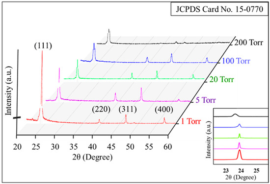 The D parameter relates to the crystallite size or the intermediate diameter of single-crystal orientation in polycrystalline, and decreasing crystallite size increases the lattice mismatch. Table 3 traces X-ray data of 2θ, the crystal structure of the deposited CdTe thin films, analysed by the advanced XRD-6000 system. Here, XRD patterns shown in Figure 2 demonstrate the intense desired diffraction peak at 2θ = 23.9°, confirming the pure cubic structure of (111) orientation [2]. As a matter of fact, X-rays penetrate to the thickness of around 2 μm and, clearly, XRD results are focused on the bulk of CdTe layer [23]. However, Figure 2 shows the angular positions of preferred orientation (111) and other low intense peaks are slightly shifted for the sample deposited at 200 Torr. It has been found that the peak shift has resulted from the Te residue at the surface of the films under compressive stress as verified by a previous study [24]. Also, hydrostatic pressure analysis on Te validates the downward shift of Te atoms with increasing pressure [12]. The shift toward lower angles might also be due to the existence of both uniform strain (tension) that displaced the peaks and non-uniform strain (compression) that causes the peaks to expand. This phenomenon may be a sign of structural change caused by a change in mechanical response (adhesivity) in the samples [25].