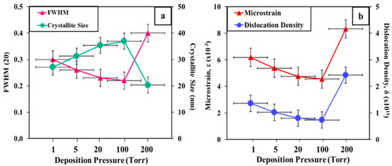 The average crystallite size is about 21 nm to 38 nm, which increases with the rise in pressure until 100 Torr and decreases thereafter. While depositing the CdTe film at 200 Torr, the collision among species is extremely high due to very low MFP. Hence, the compression stress increases and causes alteration from the initial orientation to a reduced crystalline phase. Also, lower adhesion due to week atomic bond structure is resulted [32]. Accordingly, the preferred orientation is lost upon high-pressure deposition and the growth rate also decreased. The reduction of the XRD intensity in non-stoichiometric films may be explained by the poor crystallinity in high pressure [33]. High deposition pressure reduces the MFP enhancing the collision probability [31] and lattice constant changes, respectively. Here, the lattice constant is unchanged at ~ 0.64 nm. However, due to the change in crystal orientation at high pressure, a small alteration is detected for the sample deposited at 200 Torr. Figure 3a illustrates the FWHM and crystallite size changes with deposition pressure. Moreover, microstrain and dislocation density variation with growing pressures are shown in Figure 3b. The displayed error bars indicate the identical validity of the provided data for all of the intervals.
