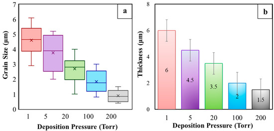 (a) Grain size and (b) thickness of CSS deposited films at different pressures.