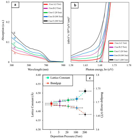 Solar spectrum and semiconductor studies reveal that the optimum bandgap of the absorber layer requires to be in the range of 1.4 to 1.7 eV for the AM1.5 solar spectrum [20]. The absorption graph and the Tauc plot in Figure 7a,b show the changes in the absorption profile and direct energy gap (Eg) of CdTe films upon the change of deposition pressure. The direct bandgap is assessed by an extrapolated straight-line across the curve from the plot.