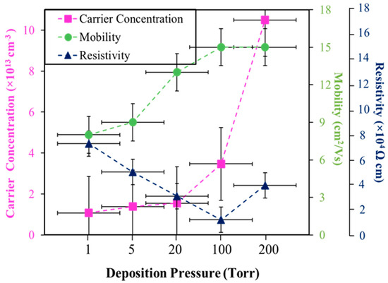 In the above equation, denotes the boundary scattering rate, whereas r, d and λ indicate the reflection coefficient, grain size and the mean free path (MFP), respectively. Only electrons within a distance of less than the mean free path from the surface can be scattered from the surface. Also, because the MFP is highly affected by the deposition ambient, surface scattering tends to impact the surface part of the thin-film resistivity [7]. Considering the reflection to be similar to identical grain boundaries, resistivity is directly related to grain size as smaller grain size results in lower resistivity [60]. Moreover, lower carrier scattering results in an increase of mobility. Consequently, the resistivity for the CdTe thin film deposited at 100 Torr demonstrates the lowest among all, probably due to the least scattering and uniform surface morphology. It is critical to consider the impact of grain boundaries on the electrical properties and clarify the functional quality of a polycrystalline thin film. However, it is obvious that the post-deposition treatment is needed to achieve better electrical properties for CdTe thin films, even deposited on ultra-thin glass substrates for flexible solar cell applications.