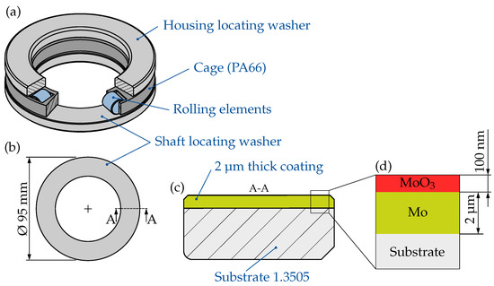 Overview of the prepared specimen. (a) Cylindrical roller thrust bearing 81212. (b) Top view of the coated bearing washer. (c,d) Cross-sectional view of the coating system (not to scale).